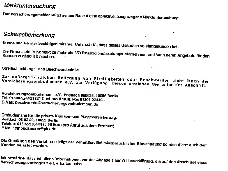 Jeder Schritt sollte protokolliert werden. Vermittlern, die es grundsätzlich eilig haben, meist nach einer sehr kurzen Beratung, die oftmals nicht mehr als eine rhetorische Empfehlung ist, schon einen Antrag zücken, sollte man nicht im Wege stehen und sie gleich wieder gehen lassen. In der Beratung sollten mehrere Angebote gemacht werden, die inhaltlich auf fachlicher Basis unterschieden werden. Es geht nicht um eine Portion Pommes, es geht um die Absicherung finanzieller Kosten. Der Vermittler sollte die Angebote dem Kunden in Kopie zum Beratungsprotokoll zum Ende der Beratung übergeben. Ein „Allgemeiner Produktverkauf“ kann kein Beratung sein, die der Kunde wählte. Was ist eine objektive und marktausgewogene Untersuchung? Achten Sie auf das Wording Ihres gegenüber. Möglicherweise braucht eher vorab einen Rat, um sie beraten zu können