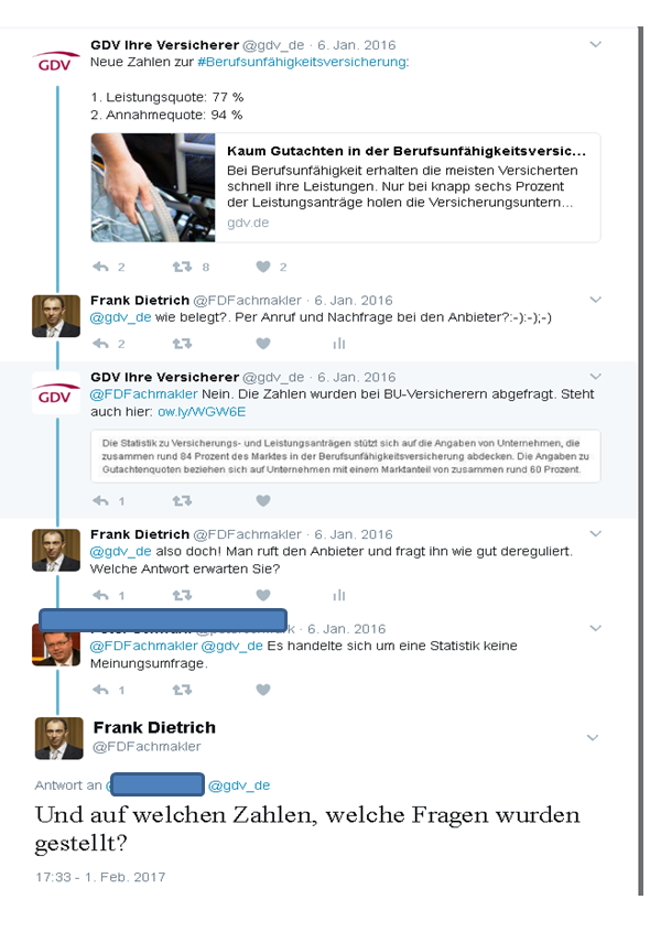 Welche Fragen gestellt wurden, wurden nie beantwortet. Ganz im Gegenteil zur Transparenzanalyse des PremiumCircle. Auch die profane Bemerkung des Herrn S., dass es sich um eine Statistik handelt und keine Meinungsumfrage, regt zum Nachdeken an. Woran aber unterscheiden sich beide Möglichkeiten? Meinungen müssen nicht zwingend notwendig belegt werden, Statistiken in ihren Einzelheiten aber schon. Bis dahin bleibt es eine Meinungsumfrage, denn die Versicherer meinen lediglich was sie sagen, belegt haben sie es bisher nicht. Erst denken, dann reden lieber GDV.
