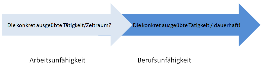 Aus Arbeitsunfähigkeit wird Berufsunfähigkeit immer dann wenn der Zeitraum (Prognose) der Erkrankung mindestens sechs Monate andauert und eine Prognose im Sinne der Heilung nicht wirklich möglich ist.
