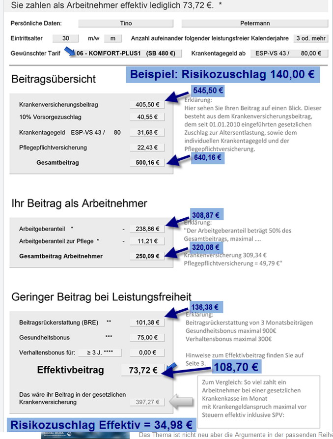In der Werbung des Anbieters, wie man auch hier erkennen kann, geht es um Beitragsrückerstattung, Gesundheitsbonus und einen eventuellen Verhaltensbonus. Beachtlich ist auch das geringe Krankentagegeld gegenüber einem Angestellten, der versicherungsfrei ist. Hauptsache billig?