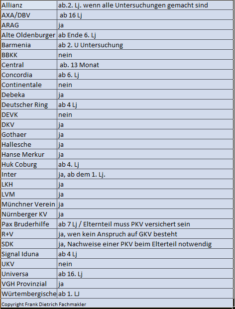 sofern Sie Ihr Kind nicht bei dem Versicherer in der privaten Krankenversicherung versichern möchten, bei dem sie bereit sind, so wählen Sie bitte sorgfältig und nur auf Basis der Leistungen, die geboten worden, einen neuen Anbieter. Beachten Sie die unterschiedlichen Annahmerichtlinien, die jeweils unterschiedliche Obliegenheiten bei Antragstellung schaffen, wenn ein Kind dort allein versichert werden soll.