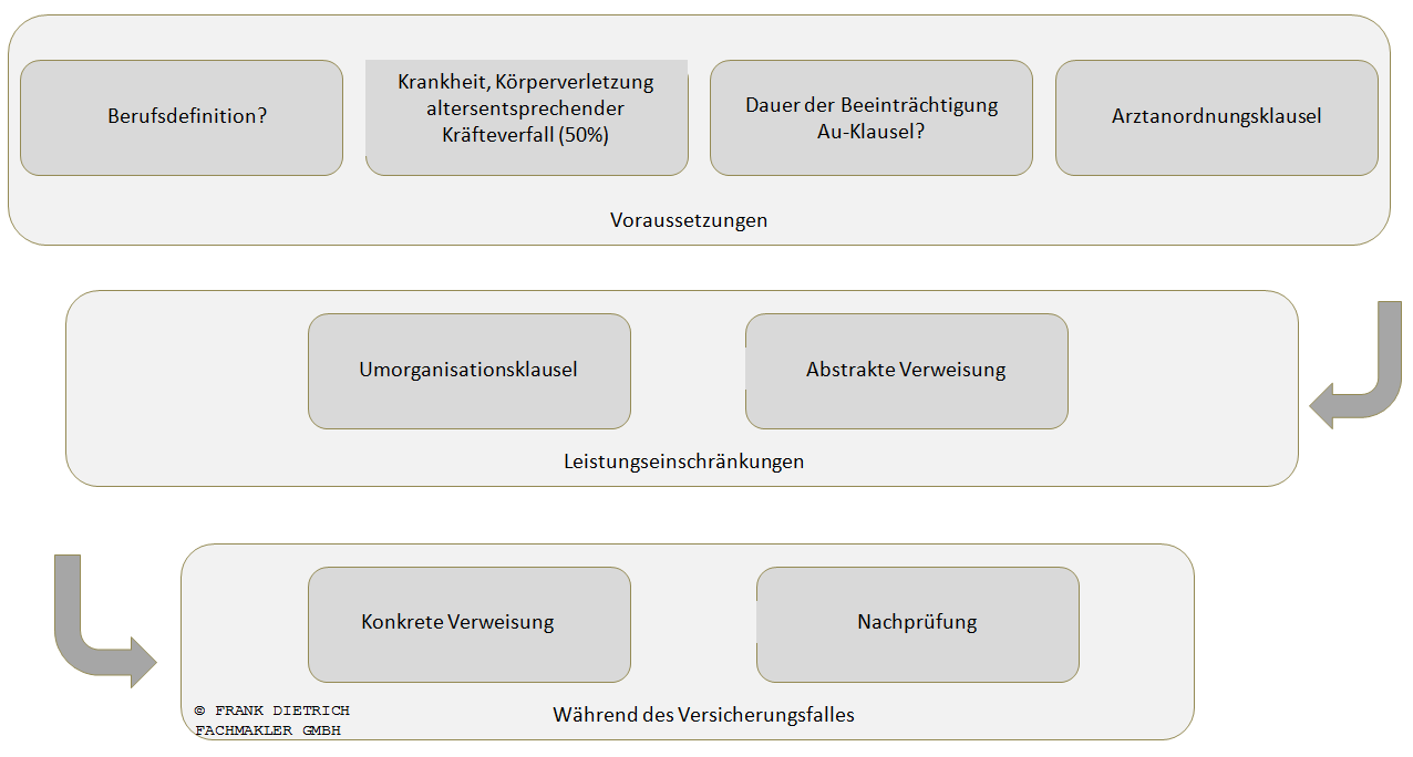 • Wie ist die Nachprüfung gegenüber der Erstprüfung zur Bemessung der Berufsunfähigkeit definiert? Gerade hier endet für Betroffene der Versicherungsschutz bereits nach kurzer Zeit, weil das Berufsbild als solches nicht mehr gilt.
