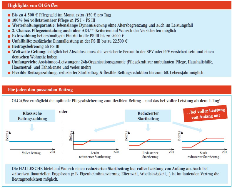 Das Produkt der Hallesche Krankenversicherung, genannt Olga, dynamisiert alle drei Jahre um 10 %. OlgaFlex alle zwei Jahre in Höhe von 5 %. Beide Produkte decken die finanzielle Lücke bei Pflegebedürftigkeit als Tagegeld ab. Sehr zu empfehlen, gerade auch für jüngere, da bei OlgaFlex der Beitrag entsprechend der finanziellen Situation des Versicherten angepasst/gesteuert werden kann.