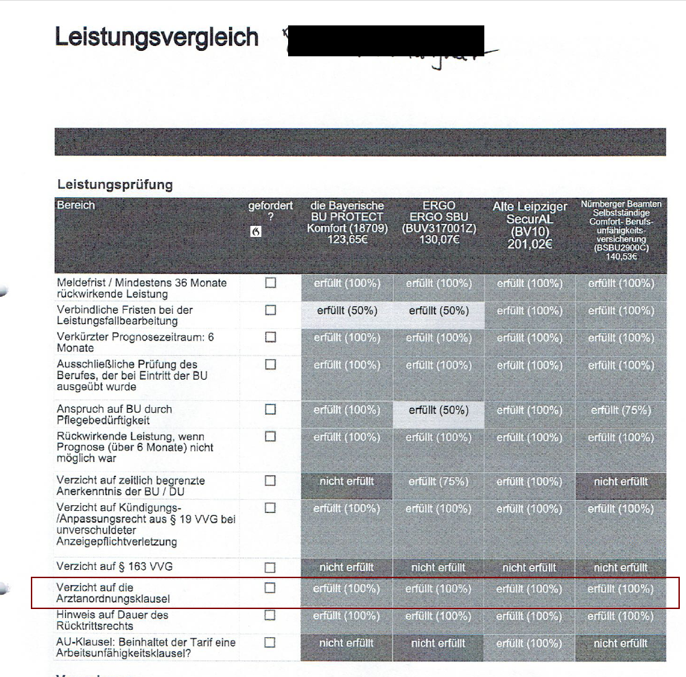 Auch hatte der Kollege mit den Befunden des Interessenten eine Rundfrage gestartet, egal, wen er im Vergleich aufgeführt hatte. er erhielt für eine gewisse Vorerkrankung einen Leistungsausschluss. Die erste konkrete Anfrage durch unser Haus konnte das nicht bestätigen. Hier zeigt sich die unterschwellige Art der Aufbereitung der Daten und auch deren Vollständigkeit, die zwar Anfrage gebracht werden.