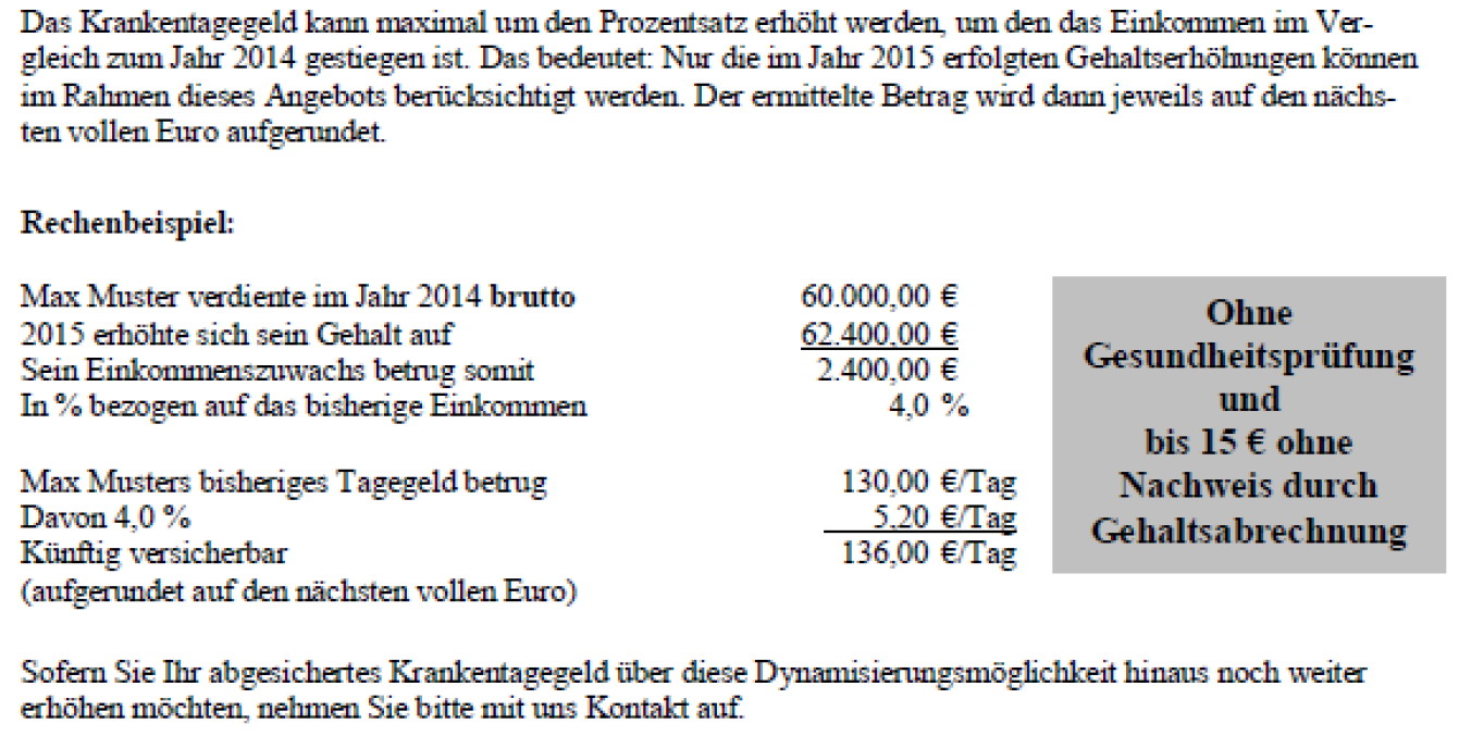 Was für den einen Anbieter „normal“ ist, ist für andere kein Vertragsbestandteil. Wie auch im letzten Jahr, bietet die Hallesche die Anpassung des Krankentagegeldes, natürlich ohne erneute Gesundheitsprüfung und im Rahmen der entsprechenden realen Erhöhung des Einkommens mögliche Apassung ihren Versicherten an.