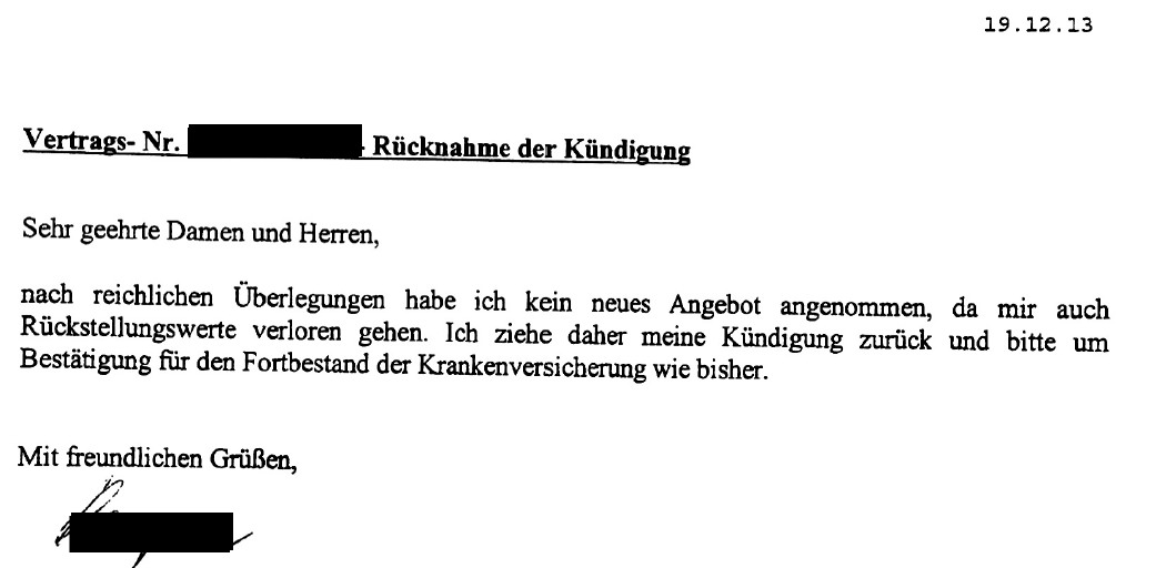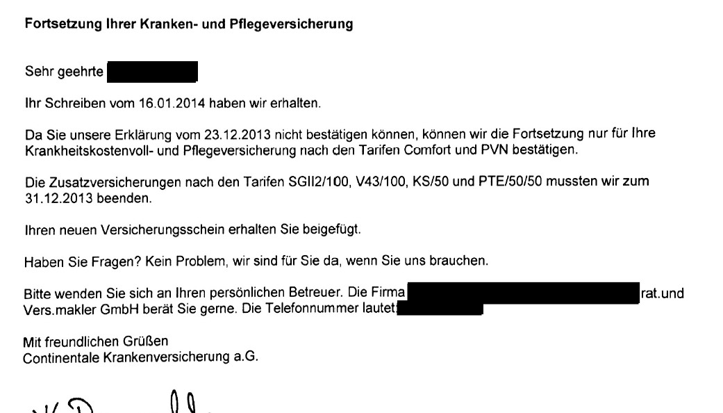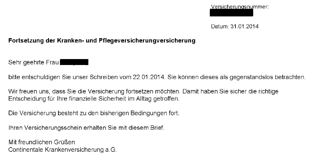 Eine Mandantin, inhaltlich aus der Gesamtheit der Möglichkeiten des Marktes für die PKV beraten, kündigte ihren Vertrag bei der Continentalen Krankenversicherung innerhalb der ordentlichen Kündigungsfrist im September zum Jahreswechsel. Die Kündigung, sorgsam formuliert, ging an Continentale Ende September 2013.