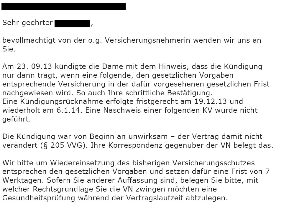 Auch telefonierte die Versicherungsnehmerin mit der Sachbearbeiterin und diese bestätigte wiederholt die Forderung nach einer erneute Gesundheitsprüfung. Man bat uns nun um Hilfe.